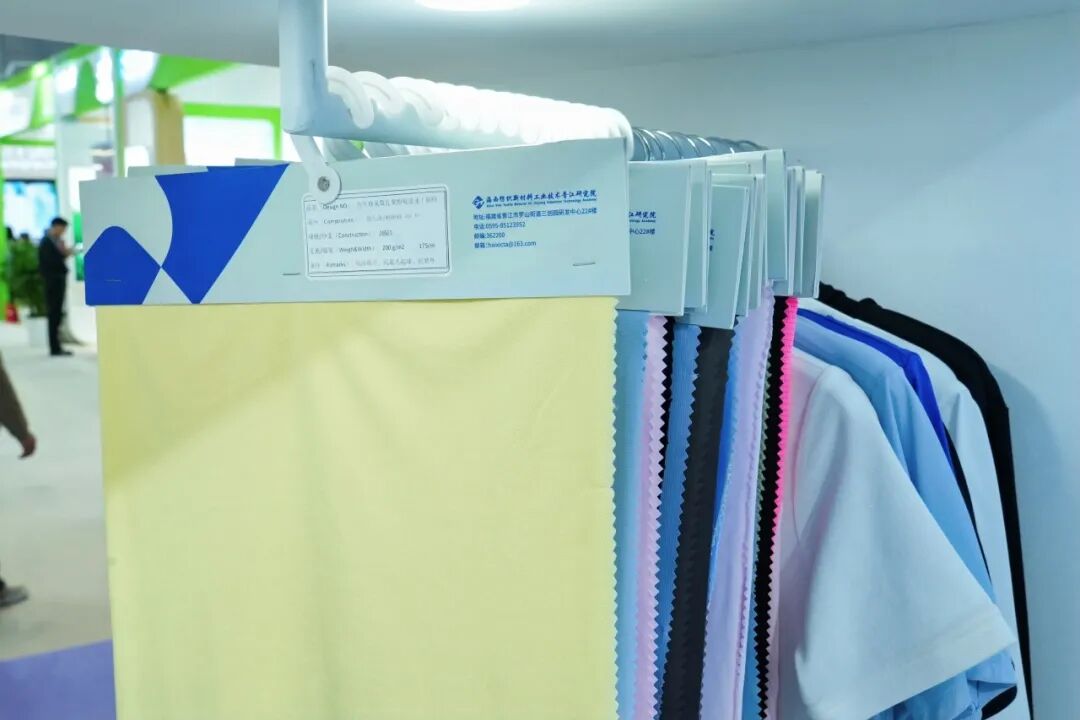 此外,通用技术中纺院成果转化中心还携子公司福建海纺新材料科技有限公司展出仿生蜂巢微孔聚酯吸湿速干纤维、凉感遮热复合纤维、锦涤皮芯超级黑无尘纤维、聚乳酸抗菌复合纤维及其制品,以及护士服、工装厂服等15款新品。其中,凉感遮热复合纤维以“凉感+遮热+可染”三重优势,成为夏季功能性面料研发的亮点产品。作为展团技术背书的核心力量,从暖体假人、汽车内饰、跨境电商检测,到认证、自研纺织标准样品技术服务,以全方位的标准、检验、检测、计量、认证能力,为纺织全产业链产品质量提升与国际贸易保驾护航。