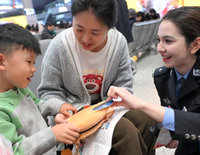 1月30日,在乌鲁木齐铁路公安处举办的“新疆铁警‘警馕’妙计助您平安回家”安全出行宣传活动中,民警将内置有安全出行卡片的文创产品送给参与活动的旅客。